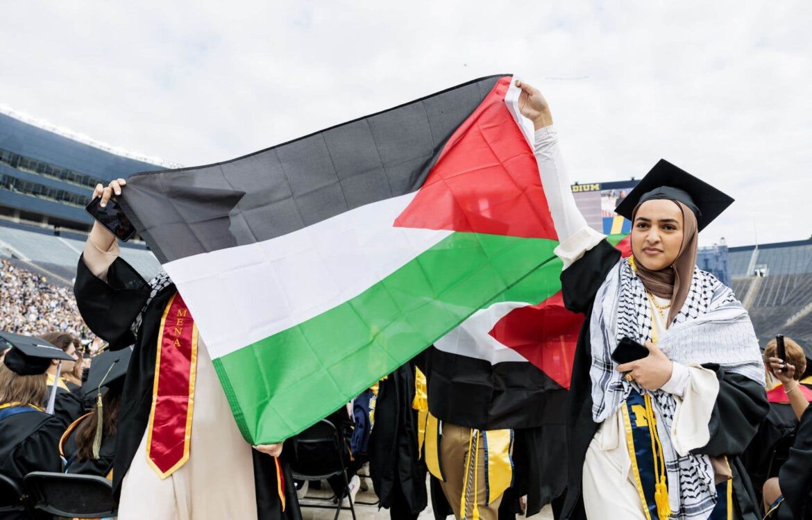 The protest took place at the start of the event at Michigan Stadium in Ann Arbor. About 75 people, many wearing traditional Arabic keffiyehs and graduation caps, marched down the main aisle toward the stage where diplomas were presented.