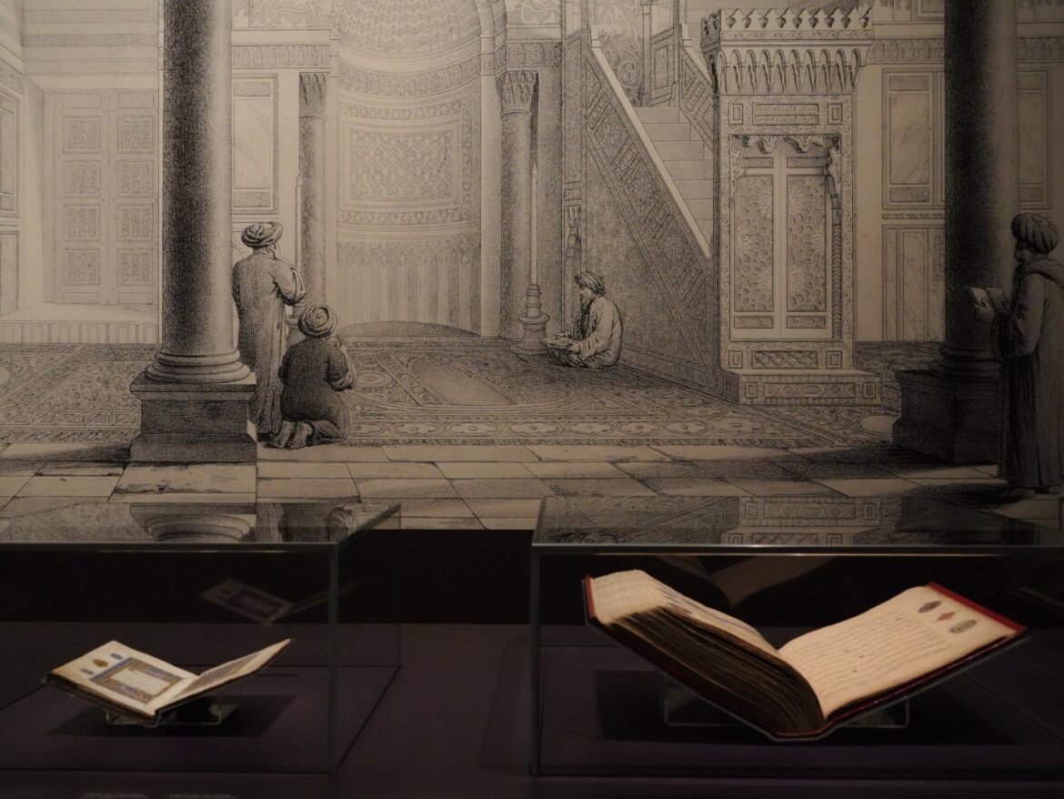 Every detail in the exhibition is pronounced, here is a problem with decorated glass, and there is a copper shield bearing the name of one of the sultans with engineering lines as if it was built to resist time, and on the other side a page of a Qur’an written by the Golden Shami supply.