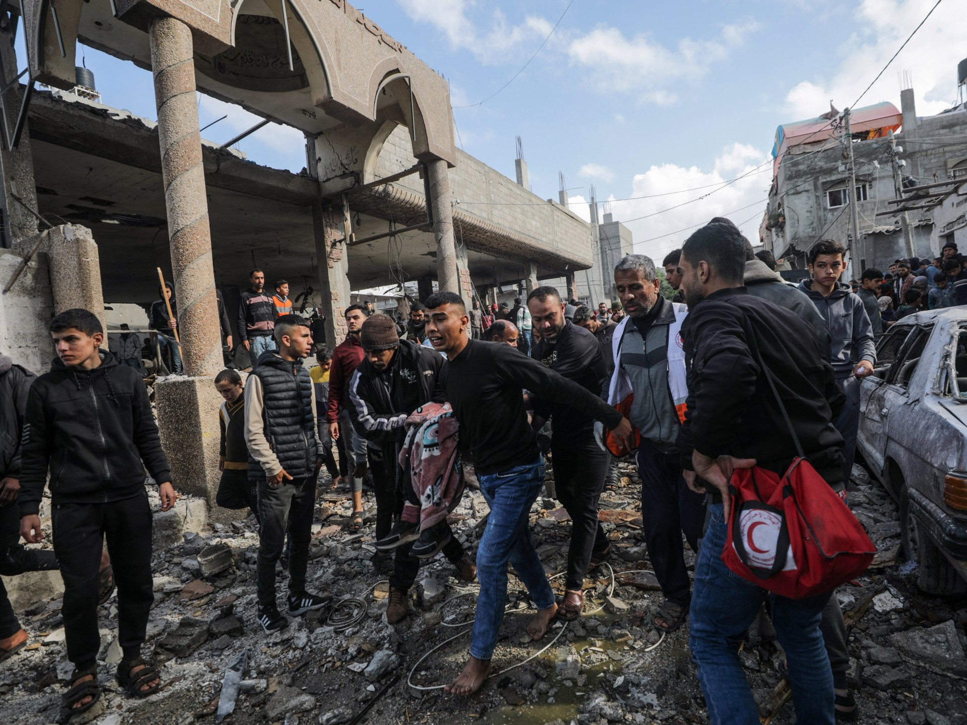 Israeli air attacks on a mosque and houses deemed “safe” in Deir el-Balah killed dozens of people sheltering there, according to local authorities. In central Gaza, rescuers were filmed pulling the body of a child from the rubble.