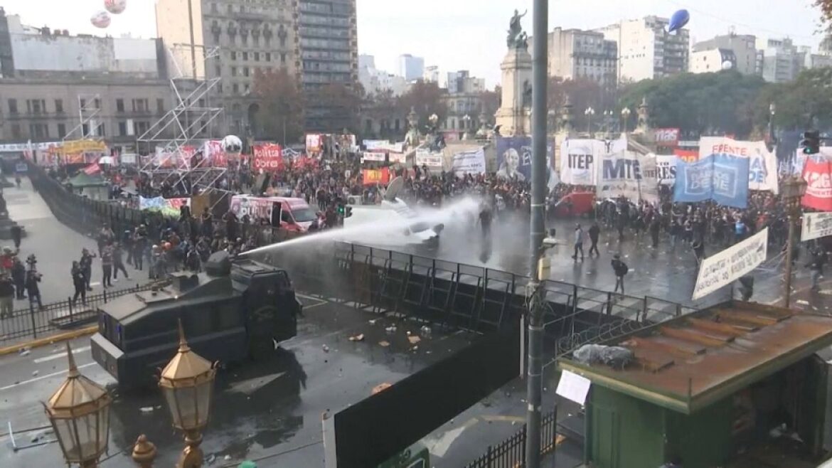 In front of the building, thousands of demonstrators protested against the president’s austerity policies.
