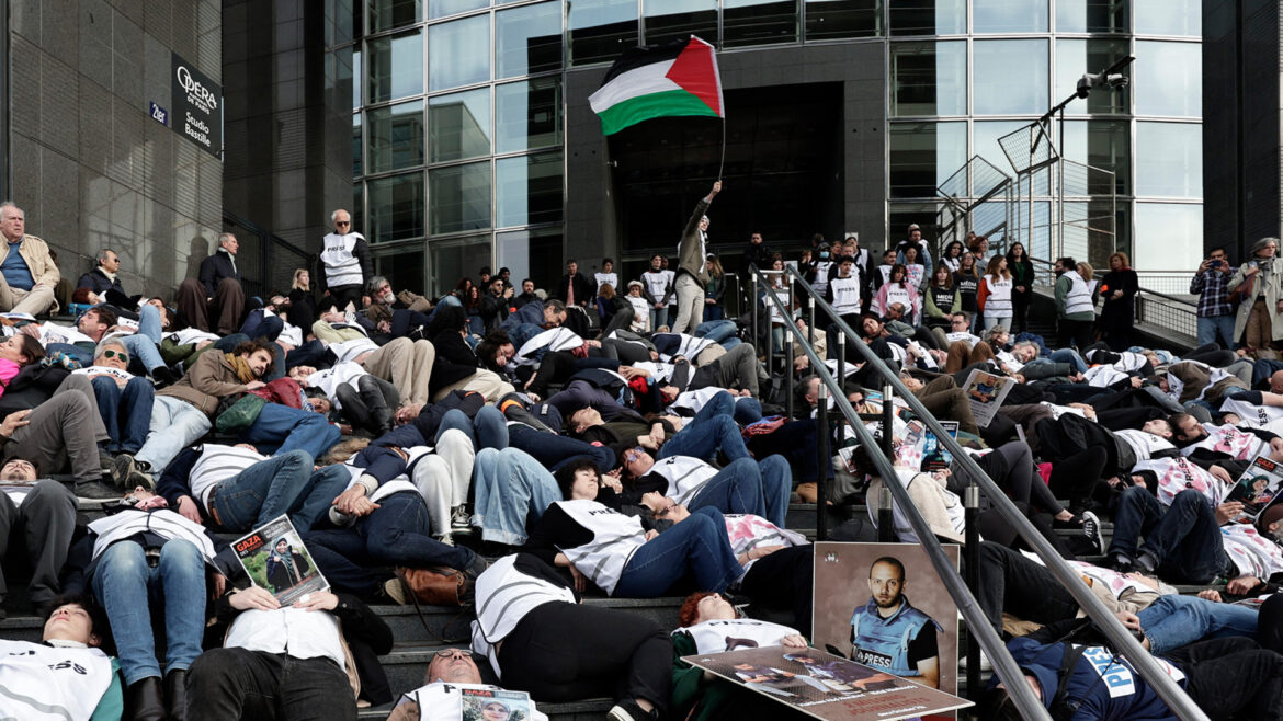 A hundred journalists organized a “matrix” on the marches of the Opera Bastille in the center of Paris to protest against the murder of nearly 200 Palestinian journalists in Gaza since the start of the war. They laid the stages of bloody press vests while the names of some of the journalists killed were read.
