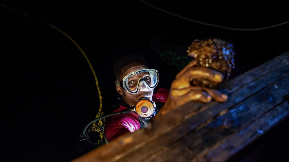 These objects are hidden in silt during the day and go out at night to move across the ocean floor, to feed on the decomposing materials. On the back of the boat, the 25-year-old Omladi Jones also sits sweat in the full-time diving suit- on the tip of the boat and looks at the dark water.