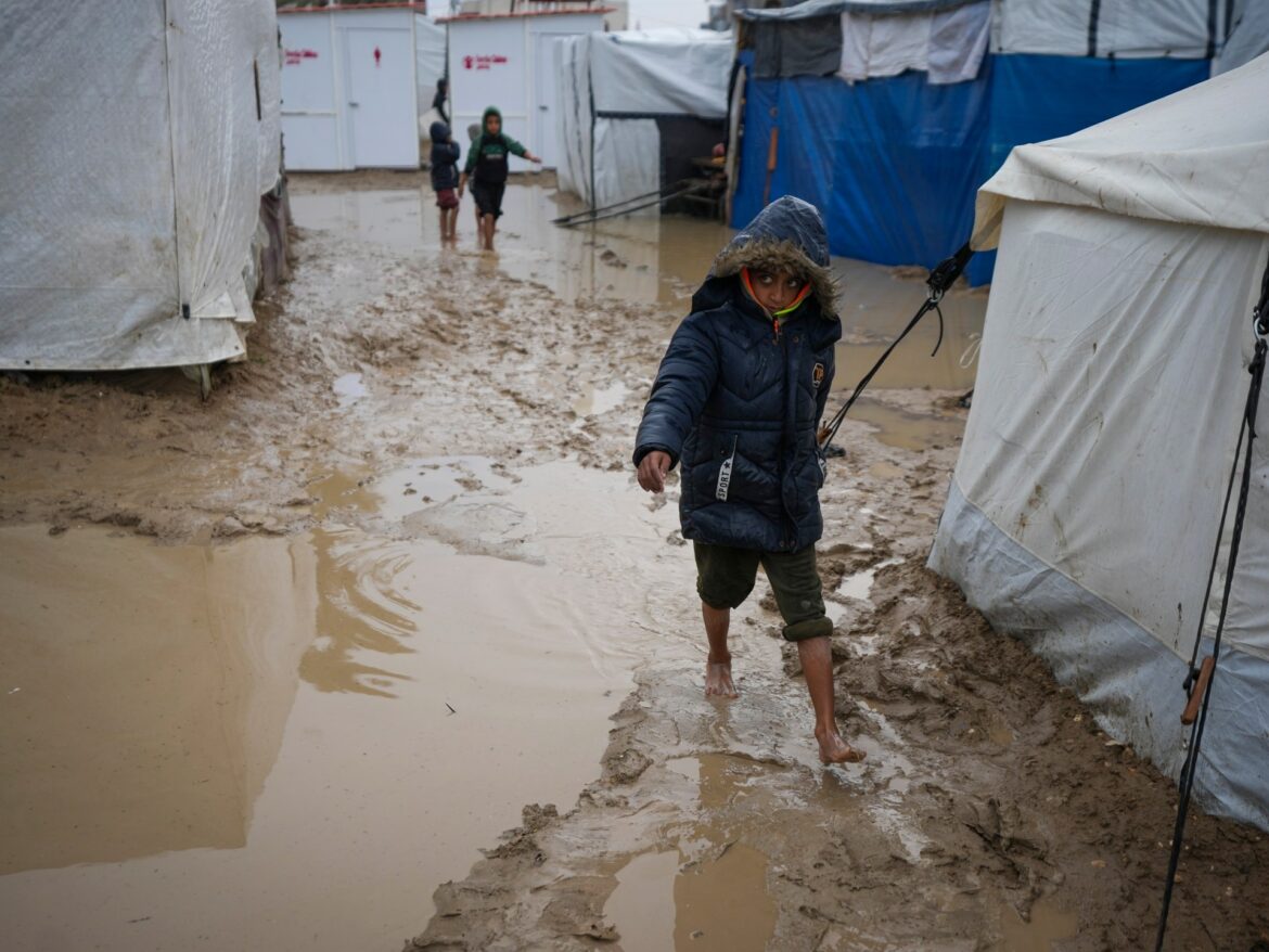 Days of heavy rain have flooded hundreds of makeshift shelters across the enclave, adding more misery to forcibly displaced Palestinians as Israel continues to restrict the entry of humanitarian aid. At least six infants have died of cold in recent days.