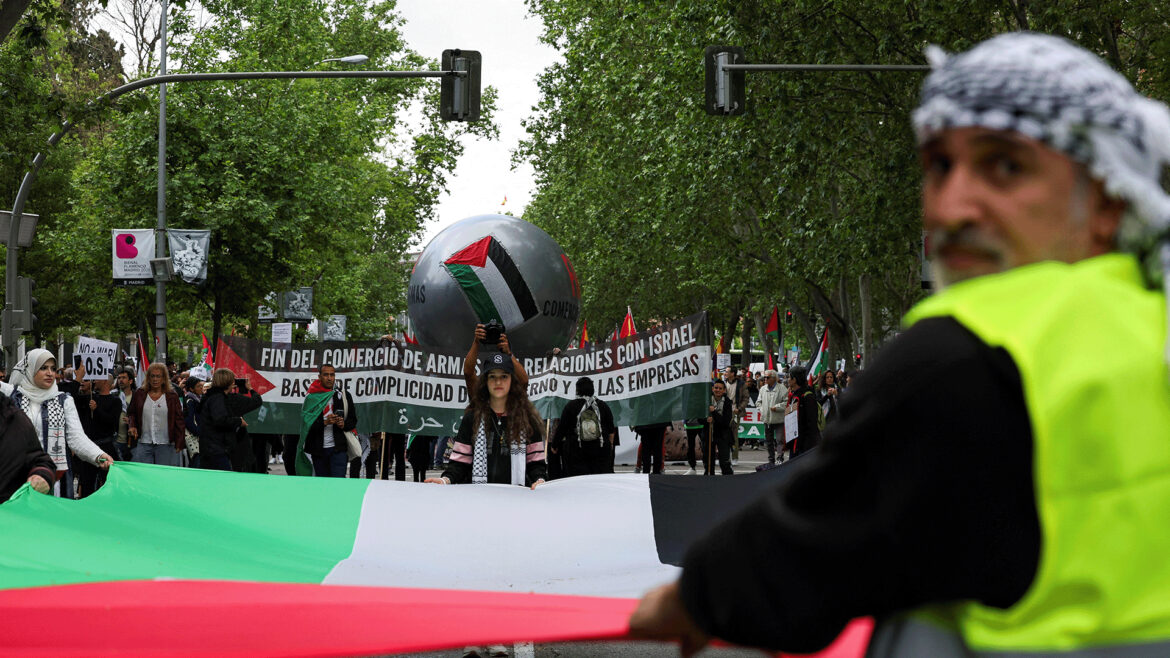 Thousands gathered in the center of the Spanish capital, Madrid, denouncing the continuous Israeli aggression on the Gaza Strip and solidarity with the Palestinian people.