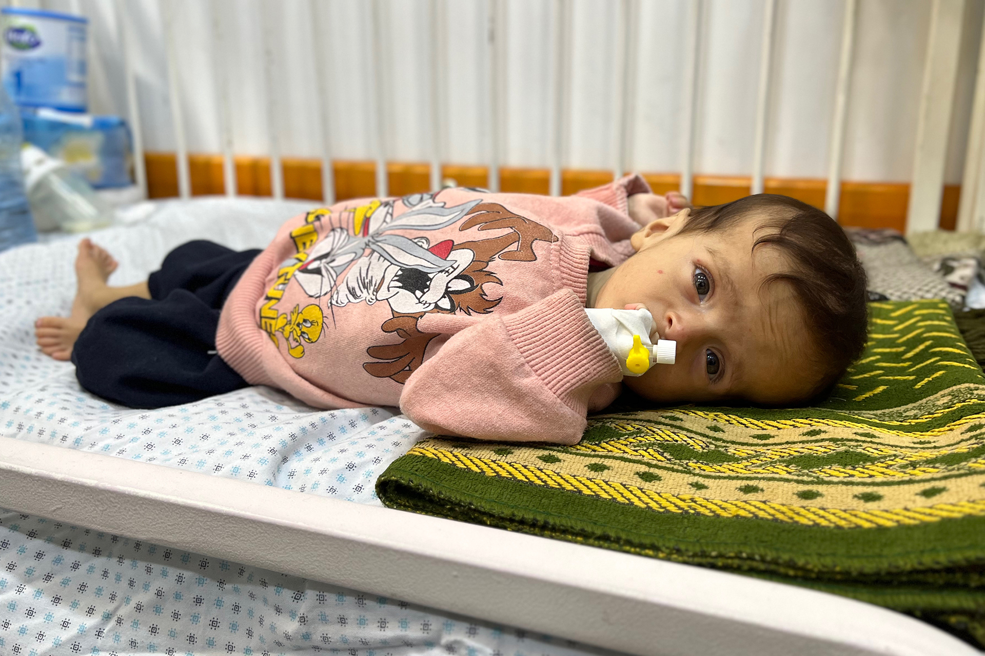 The yellowing is evident on the face of the pale baby, which refuses to eat any of the already painful canned food in the markets, which keeps it as sleeping for long hours, in the absence of a healthy food that helps her to recover.