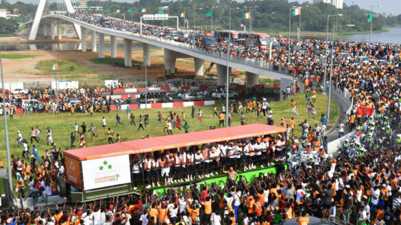As in 2015, during their previous coronation, the Ivorian players roamed the streets of the country’s economic capital, perched on the roof of a truck fitted out for the occasion, with a three-star sign on the side.