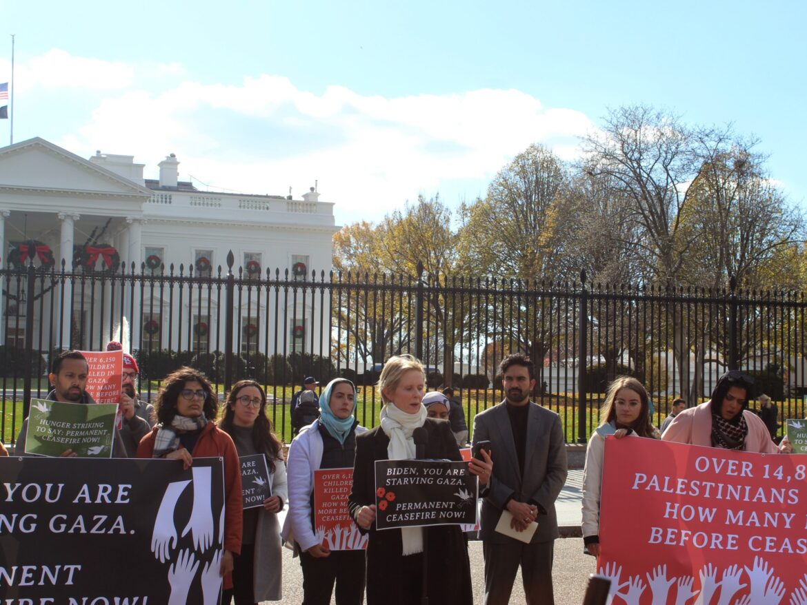 Washington DC – State lawmakers and Palestinian rights advocates, joined by actress and progressive activist Cynthia Nixon, launched a five-day hunger strike outside the White House to demand a cease-fire in Gaza.