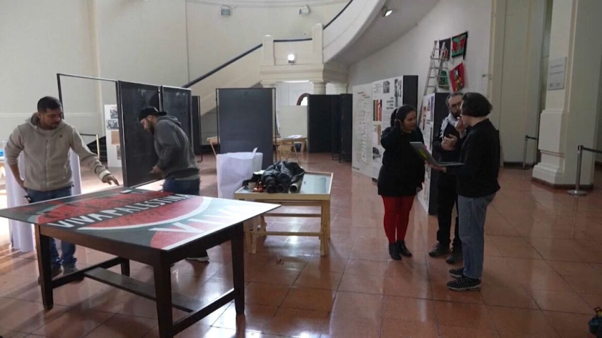 Watermelons feature prominently in the exhibition. The watermelon shares the colors of the Palestinian flag and became a symbol of resistance after the flag symbol was banned.