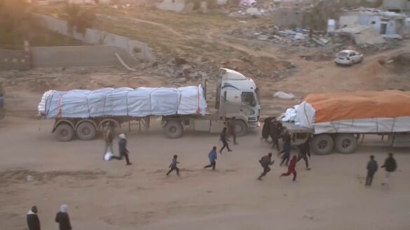 A video from the Associated Press shows residents of Gaza running towards moving aid trucks and seizing bags of food.